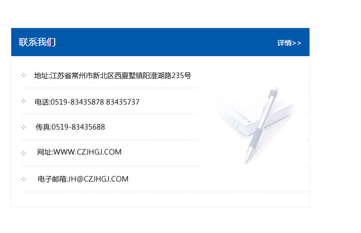 傳真:0519-83435688    郵編:213135    網址:WWW.czjhgj_com.mlq369.com    電子郵箱:JH@czjhgj_com.mlq369.com